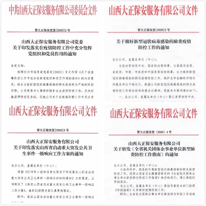 為深入貫徹習(xí)近平總書(shū)記對(duì)新型冠狀病毒感染肺炎疫情防控工作的重要指示精神,堅(jiān)決落實(shí)黨中央重大決策部署及省委、市委、市國(guó)資委部署安排,山西大正保安服務(wù)(集團(tuán))有限公司印發(fā)《關(guān)于做好新型冠狀病毒感染的肺炎疫情防控工作的通知》、《山西大正保安服務(wù)有限公司關(guān)于印發(fā)落實(shí)山西省啟動(dòng)重大突發(fā)公共衛(wèi)生事件一級(jí)響應(yīng)工作方案的通知》,要求公司各部門(mén)把防控疫情作為當(dāng)前最重要的工作來(lái)抓,落實(shí)落細(xì)防控措施,切實(shí)保障員工安全,保障全市金融秩序穩(wěn)定和服務(wù)單位平穩(wěn)運(yùn)行。集團(tuán)公司黨委印發(fā)了落實(shí)在疫情防控工作中充分發(fā)揮黨組織和黨員作用的通知,要求基層黨支部、全體黨員深刻認(rèn)識(shí)疫情防控形勢(shì),全面落實(shí)我市五嚴(yán)五防措施,用實(shí)際行動(dòng)踐行初心使命。