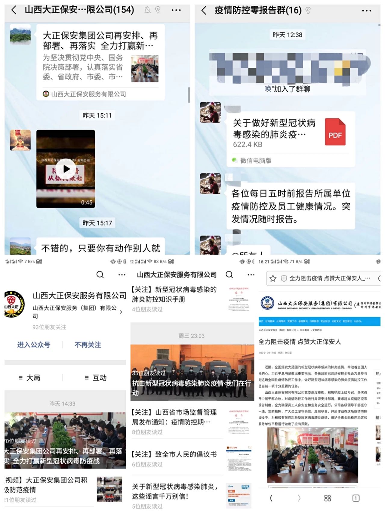 山西大正保安服務(wù)(集團(tuán))有限公司承擔(dān)我市金融行業(yè)從金庫(kù)安全到接送款保障的重要任務(wù),還有我市14個(gè)縣市政府機(jī)關(guān)、醫(yī)療機(jī)構(gòu)、水電氣供應(yīng)等重要單位的安全保衛(wèi),國(guó)有企業(yè)物業(yè)管理項(xiàng)目等,服務(wù)面廣點(diǎn)多,面對(duì)突如其來(lái)的疫情,保障業(yè)務(wù)運(yùn)行、防控疫情責(zé)任重大。為了積極承擔(dān)肩負(fù)的社會(huì)責(zé)任和義務(wù),發(fā)揮國(guó)有安保企業(yè)的應(yīng)有作用,團(tuán)結(jié)帶領(lǐng)廣大黨員干部打贏抗擊疫情戰(zhàn)役,集團(tuán)公司成立了“山西大正保安服務(wù)有限公司新型冠狀病毒疫情防控領(lǐng)導(dǎo)小組”。黨委書(shū)記、董事長(zhǎng)、總經(jīng)理張躍生擔(dān)任組長(zhǎng),公司領(lǐng)導(dǎo)班子成員為副組長(zhǎng),各部門(mén)負(fù)責(zé)人為成員,統(tǒng)一領(lǐng)導(dǎo)全公司疫情防控工作。公司中層以上領(lǐng)導(dǎo)全部取消休假,深入一線,靠前指揮,及時(shí)掌握防控工作動(dòng)態(tài),研究決定疫情防控的有關(guān)事項(xiàng),嚴(yán)格落實(shí)各項(xiàng)防控措施。