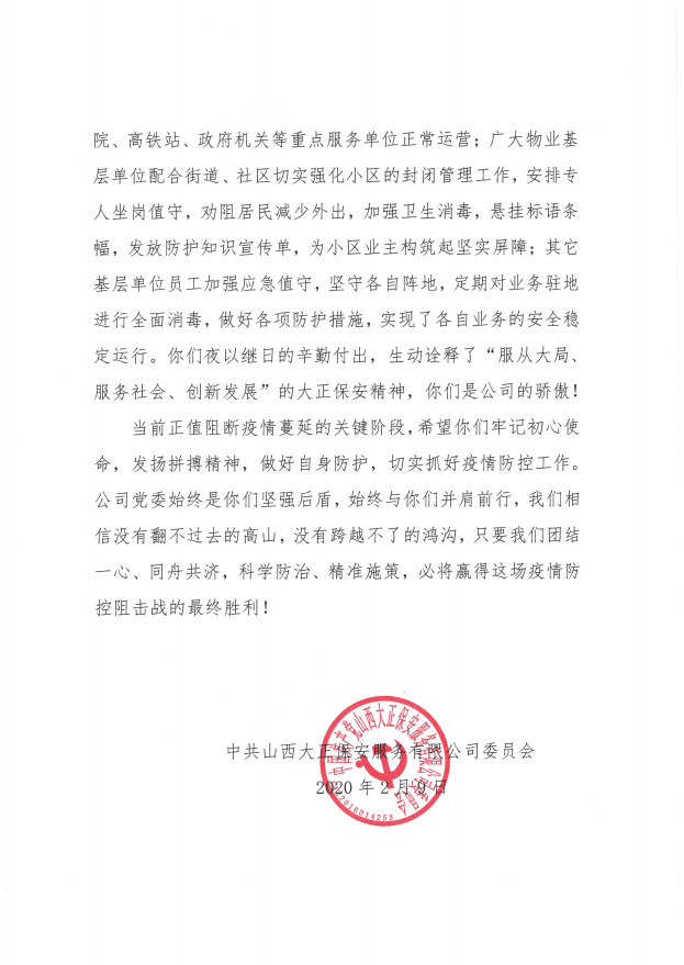 致公司疫情防控一線全體黨員、干部、員工的慰問信