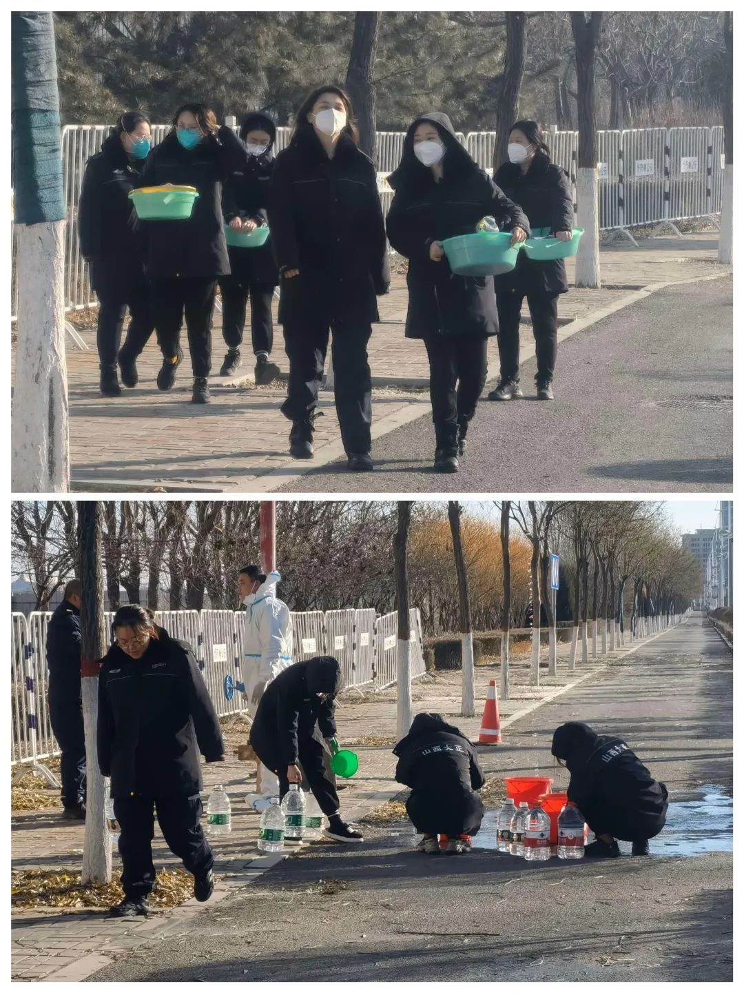來自監(jiān)控中心的兩名男隊員張航、靳龍宇主動承擔(dān)起了每次鉆到下水井放水的任務(wù),每到這個時候,女孩子們提著水桶、礦泉水瓶聚在消防水管下,不管水滴濺到身上還是臉上,搓著手跺著腳卻笑呵呵的打鬧著嬉戲著,緩解著疲憊,釋放著壓力……