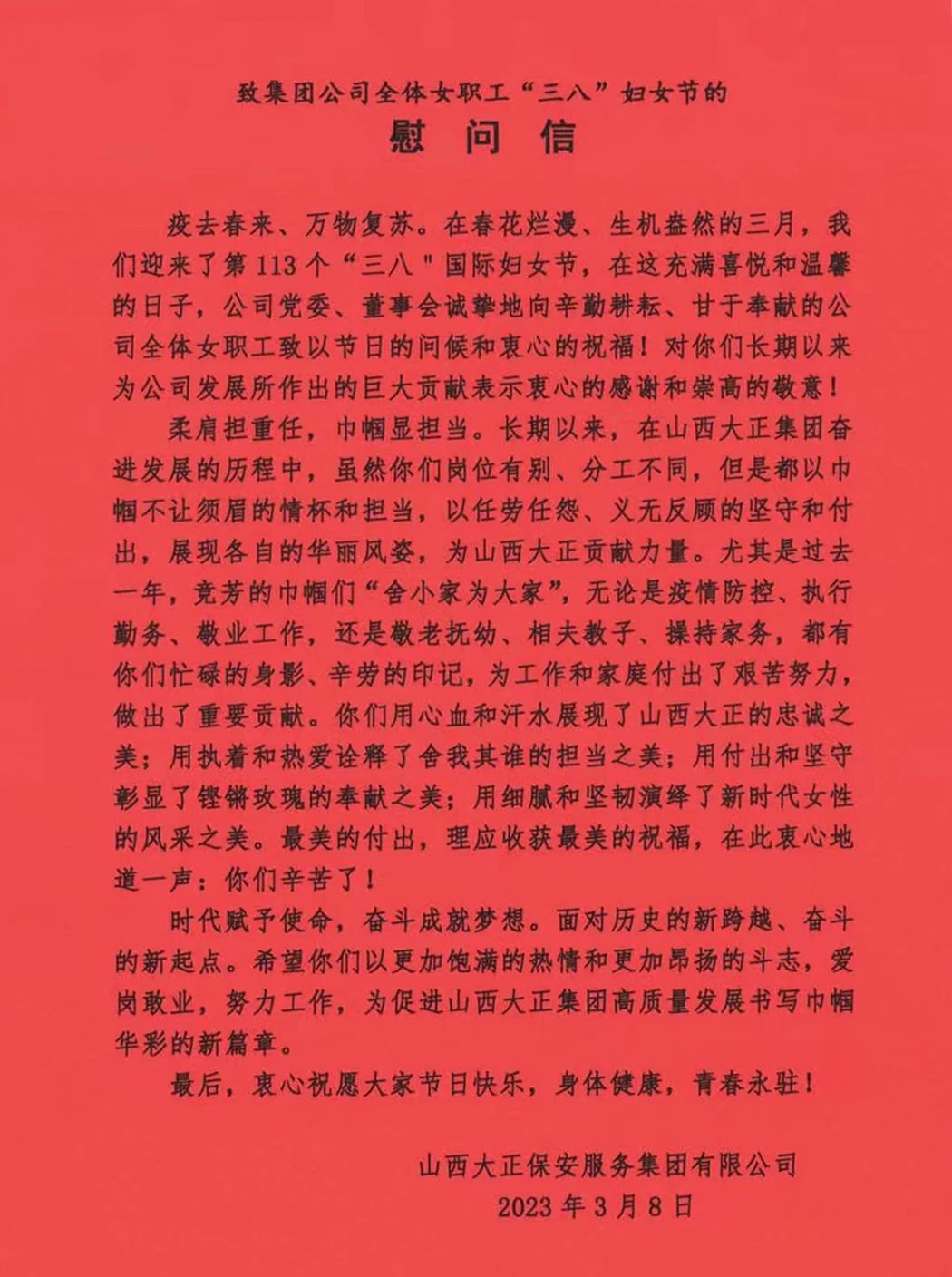 在第113個國際婦女節(jié)也是我國第100個婦女節(jié)到來之際,山西大正保安服務集團有限公司向公司所有女同胞們致以節(jié)日的問候和美好的祝愿!向所有辛勤耕耘、默默奉獻在大正各個崗位上的姐妹們表示親切的問候、崇高的敬意!