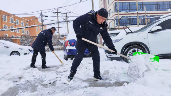 雪花紛飛,阻擋不了保安員們除雪決心。寒風(fēng)刺骨,抵擋不住保安員們掃雪的熱情。他們配合默契,分工明確,有的手持鏟子奮力鏟雪,有的鋪設(shè)防滑墊防止行人滑倒,除雪現(xiàn)場熱火朝天,他們用辛勤和汗水打通了一條條通往前方溫暖的路。