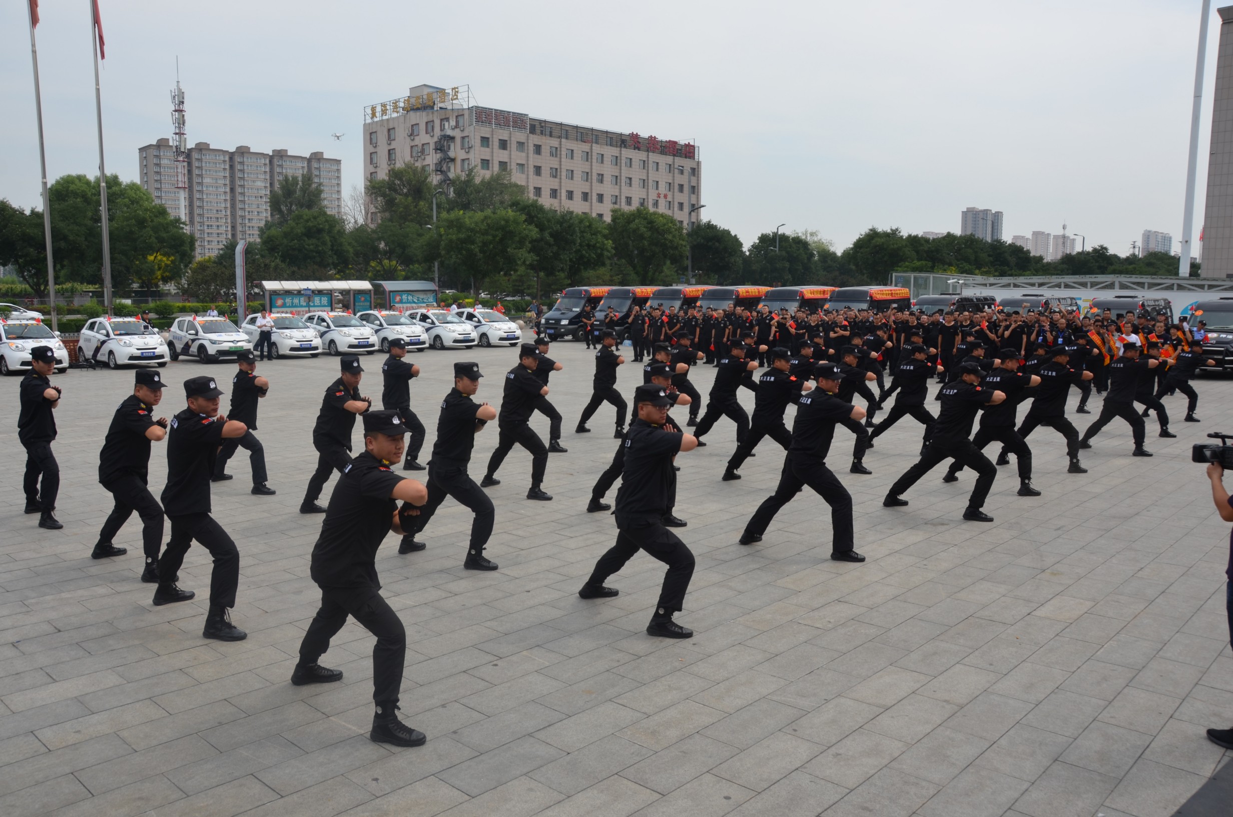 在忻州市保安行業(yè)“不忘初心跟黨走、牢記使命勇?lián)?dāng)”主題宣傳周活動(dòng)暨服務(wù)國(guó)慶安保工作誓師儀上,直屬公司安保隊(duì)員代表大正保安服務(wù)公司表演了擒敵拳,共十六式,式式剛勁有力、虎步生風(fēng),形如捉兔之鶻,神如捕鼠之貓,引來各界群眾一片賀彩。最后,進(jìn)行了車輛巡展,向市民發(fā)放了宣傳單以及宣傳口號(hào)。