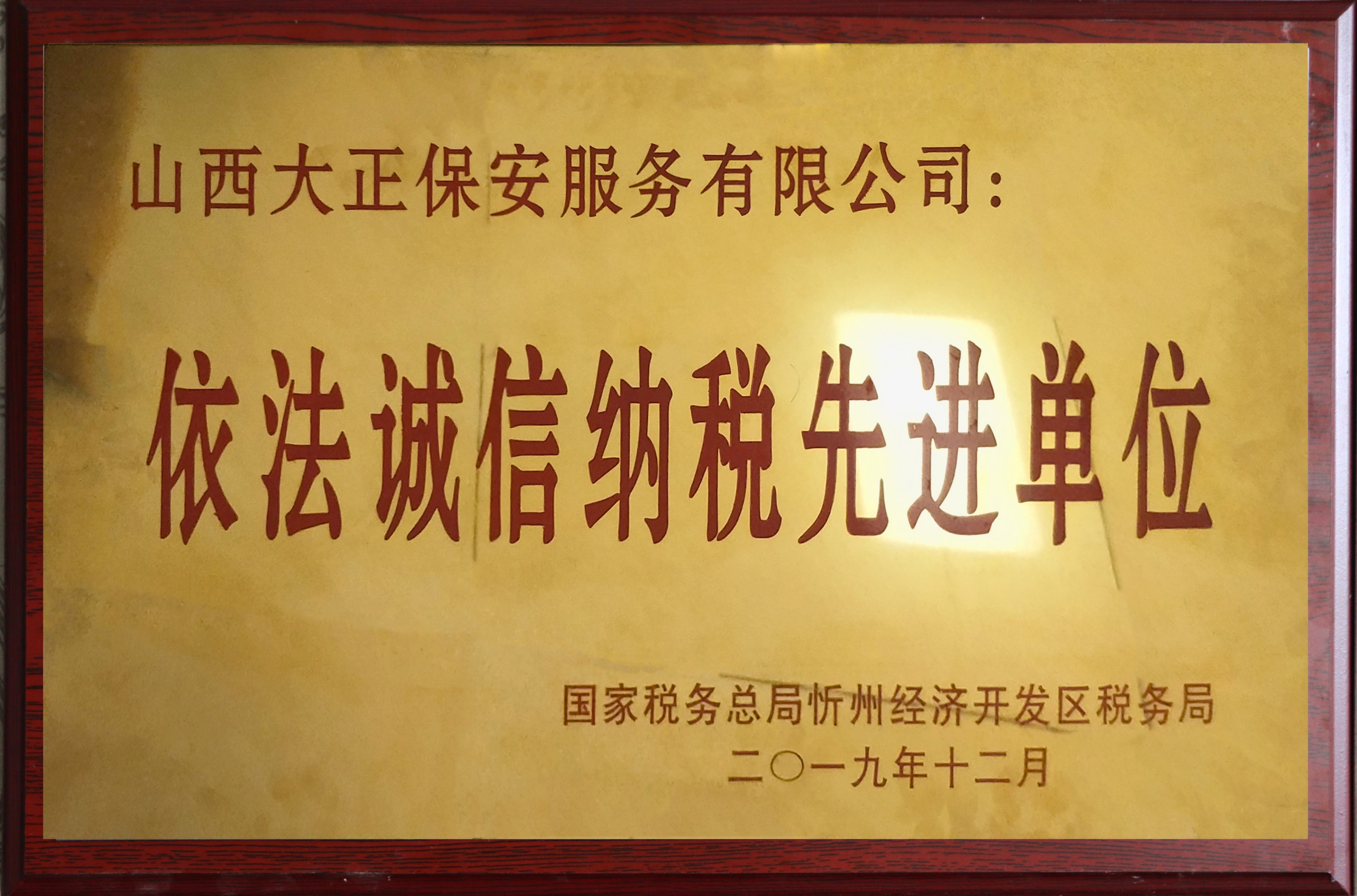 12月15日,國(guó)家稅務(wù)總局忻州經(jīng)濟(jì)開(kāi)發(fā)區(qū)稅務(wù)局舉行2019年度“依法誠(chéng)信納稅先進(jìn)單位”頒獎(jiǎng)儀式。山西大正保安服務(wù)(集團(tuán))有限公司等9家企業(yè)榮獲2019年度“依法誠(chéng)信納稅先進(jìn)單位”稱(chēng)號(hào)。集團(tuán)公司黨委委員、副總經(jīng)理趙培宏代表公司參加儀式并上臺(tái)領(lǐng)獎(jiǎng)。