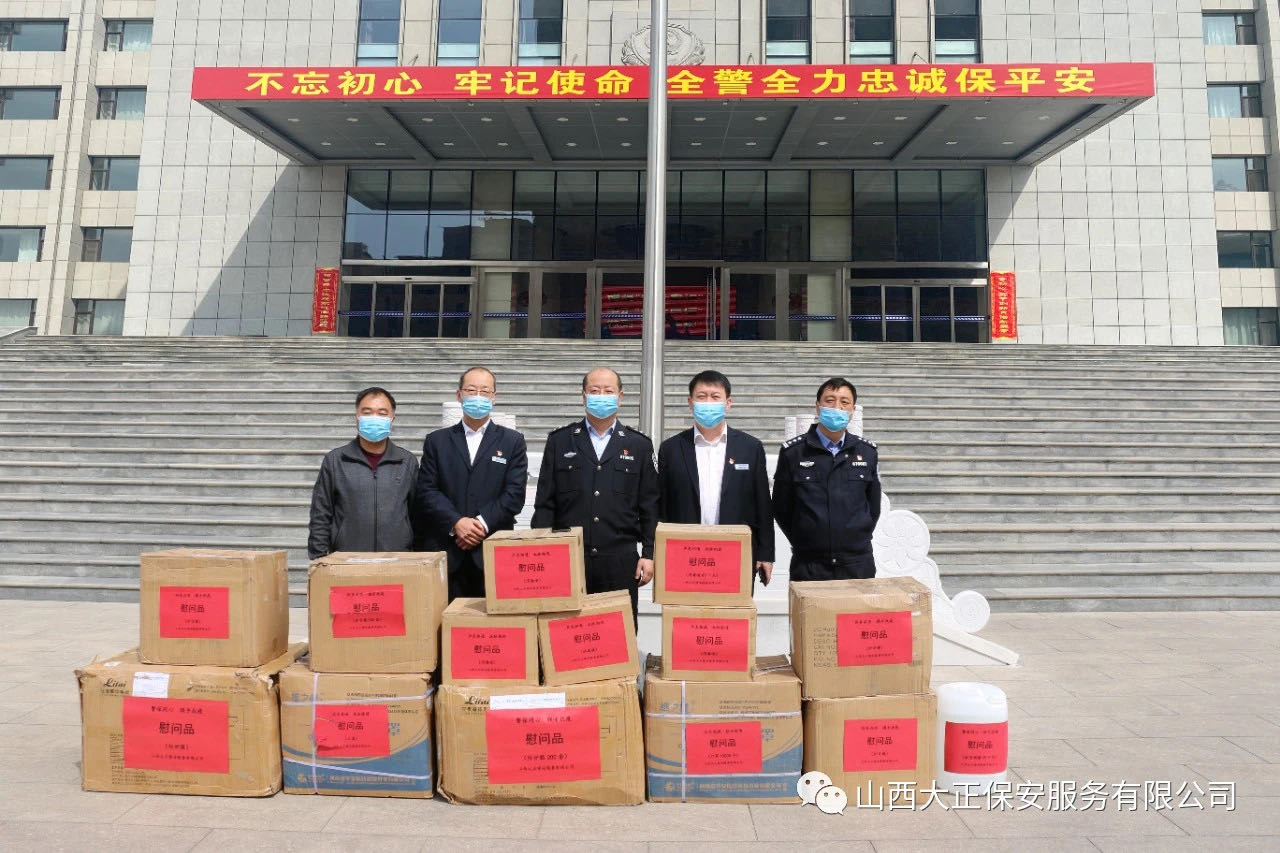 3月31日,山西大正保安服務(集團)有限公司黨委委員、副總經理趙培宏、副總經理王明生領導一行,專程來到市公安局,捐贈了醫(yī)用口罩12000、防護服200套、護目鏡500個、消毒液80㎏、醫(yī)用酒精25㎏,表達公司和干部職工對公安民警疫情防控的支持;對警保同心、聯(lián)手抗疫的信心、決心;對廣大公安民警健康的關愛。忻州市公安局副局長王雷接過物資后,代表市局對大正集團公司的捐贈表示感謝。