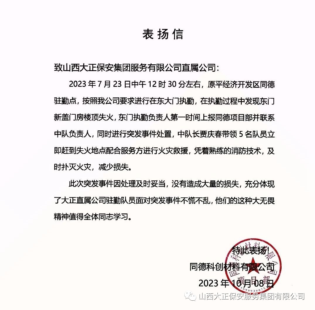 2023年10月8日,山西大正保安服務(wù)集團(tuán)有限公司收到一封來自原平經(jīng)開區(qū)同德科創(chuàng)材料有限公司的表揚(yáng)信,對原平經(jīng)開區(qū)同德對駐勤點(diǎn)全體隊(duì)員的工作提出表揚(yáng)。